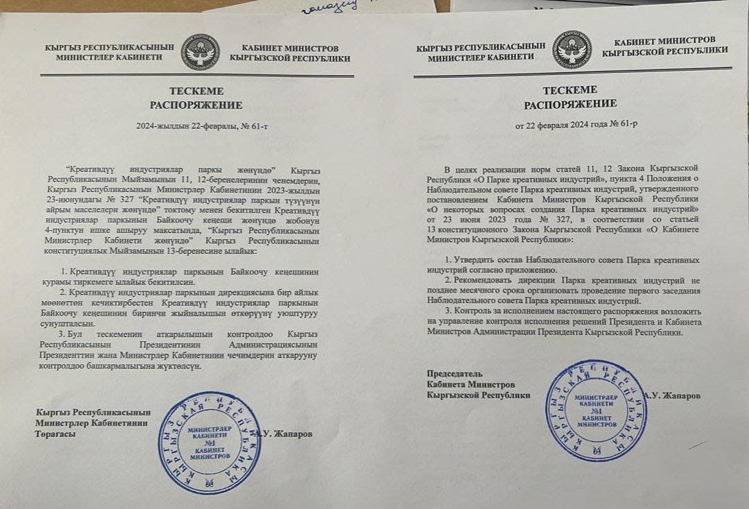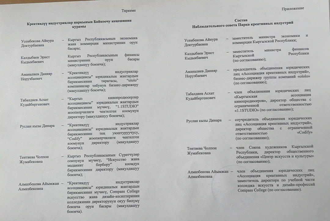 Кабмин КР утвердил состав наблюдательного совета Парка креативных индустрий. Об этом сообщил председатель Ассоциации креативных индустрий Кыргызстана Данияр Аманалиев у себя телеграмм-канале.