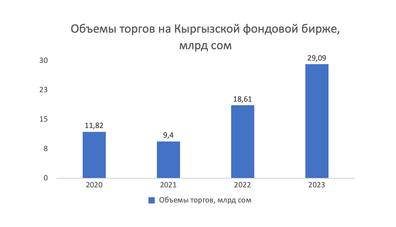 В 2023 году эти эмитенты достигли объема торгов в 29.1 млрд сомов ($331 млн по среднему курсу). Это оказалось на 56% больше, чем в предыдущем году. В общей сложности было совершено 2024 сделки.