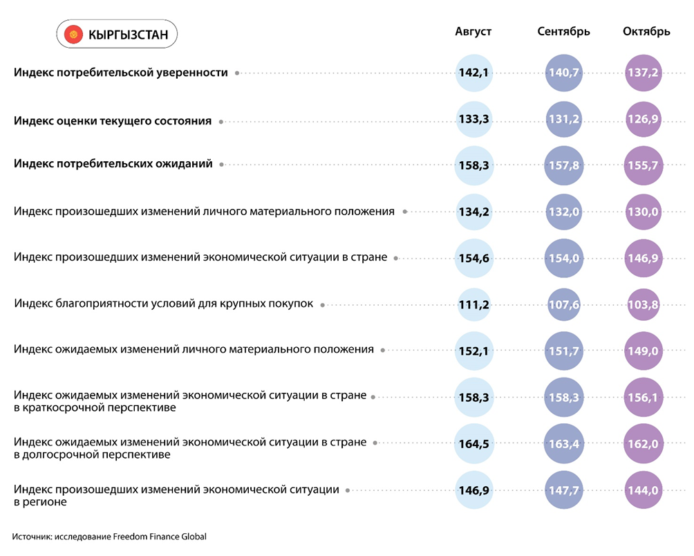 Индекс потребительской уверенности в Кыргызстане в октябре 2024 года продемонстрировал снижение второй месяц подряд, достигнув отметки 137.2 пункта. Снижение составило 3.6 пункта за месяц, при этом все пять субиндексов показали спад, отмечают аналитики Freedom Finance Global.