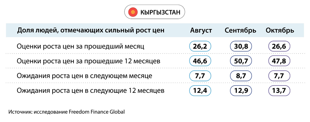 Инфляционные оценки кыргызстанцев также продемонстрировали снижение. Если в сентябре 30.8% респондентов ощущали резкий рост цен, то в октябре таких было 26.6%. Аналогичное снижение отмечено в оценках роста цен за последние 12 месяцев, с 50.7% в сентябре до 47.8% в октябре. Официальные данные по годовой инфляции показывают замедление до 4.8% против 4.9% месяцем ранее.