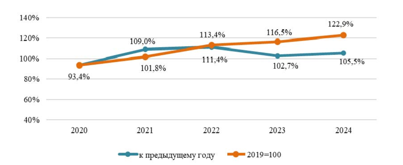 В 2024 году объем промышленного производства в действующих ценах достиг 599.8 млрд сомов. Индекс физического объема по сравнению с 2023 годом составил 105.5%, а если смотреть от уровня 2019 года — 122.9%.