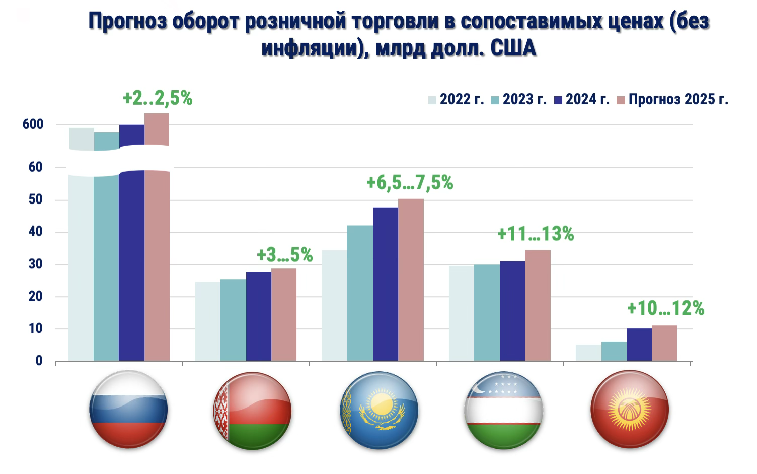 Кыргызстан способен показать прирост порядка 10–12% за счет улучшения логистики и роста благосостояния населения. Таджикистан и Туркменистан также демонстрируют стабильное расширение потребительского рынка на фоне роста численности населения и повышения доступности торговых услуг.