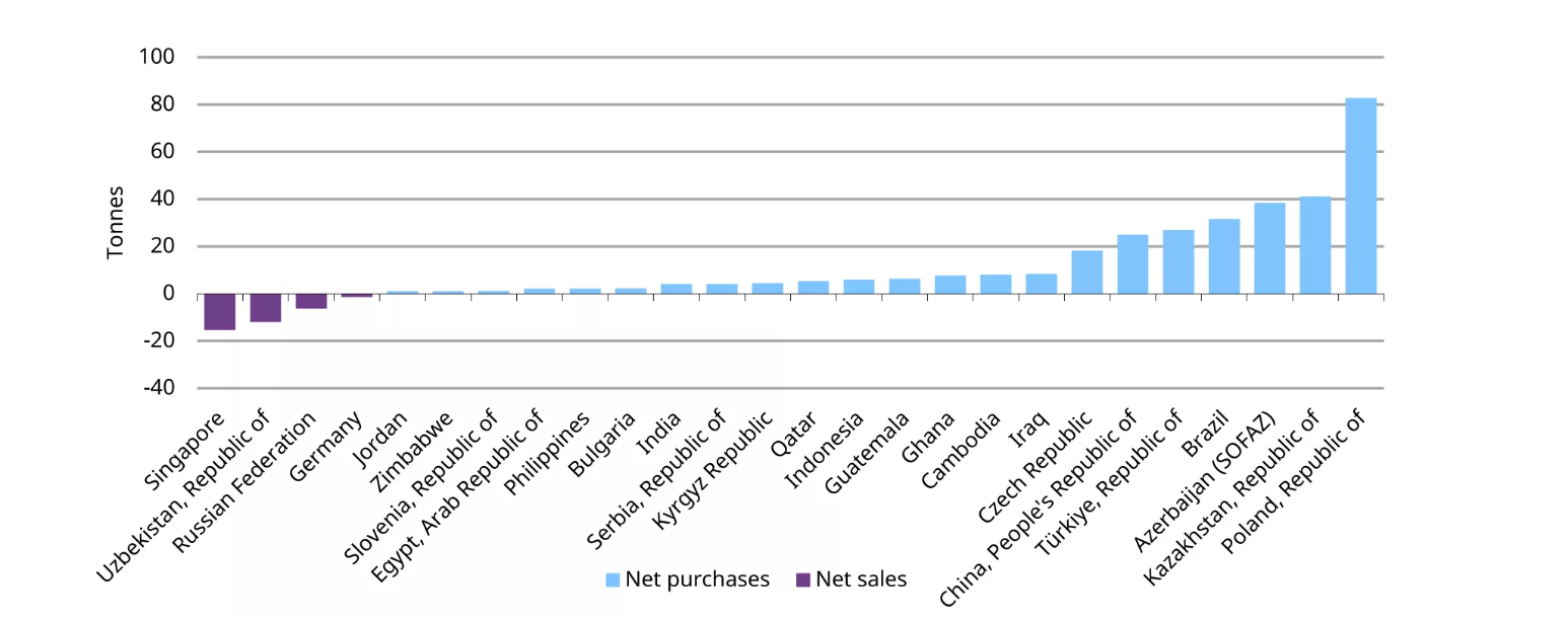 С начала 2025 года крупнейшим покупателем золота остается Национальный банк Польши (83 тонны), почти в два раза опережая Национальный банк Казахстана (41 тонна).