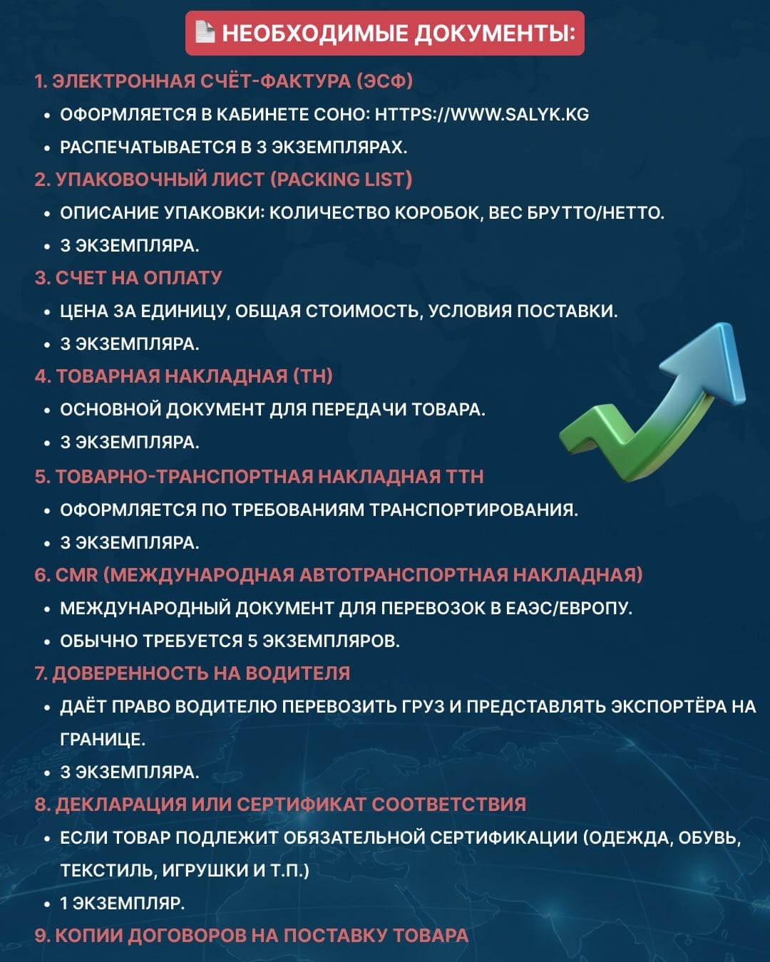 - ЭСФ (электронная счет-фактура) — оформляется в кабинете СОНО: https://www.salyk.kg, 3 экземпляра.