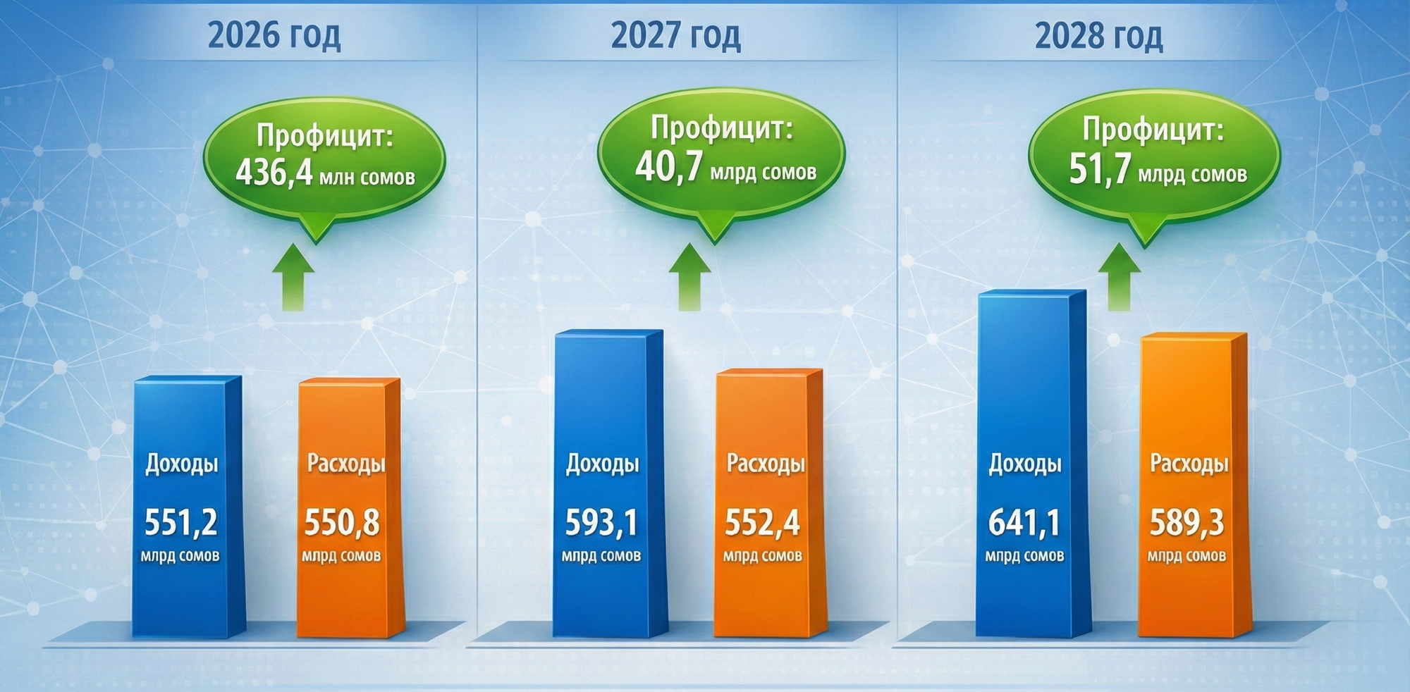 В 2026 году совокупные доходы планируются в сумме 551 млрд 207 млн 156 тысяч сомов, совокупные расходы — 550 млрд 770 млн 757 тысяч сомов, профицит — 436 млн 398 тысяч сомов.