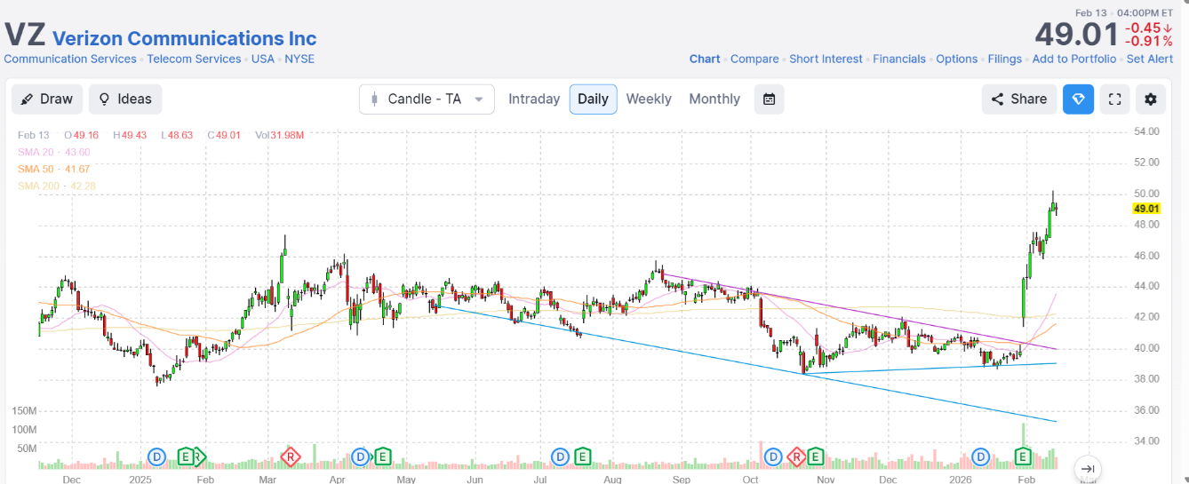 - дивидендные компании: Например, Verizon Communications дает доходность 5.74% годовых. Здесь не так важен рост самой акции, сколько регулярные выплаты;