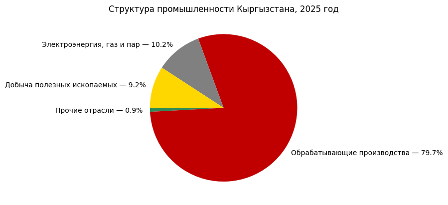 В первую очередь ознакомимся со структурой промышленного производства Кыргызстана в 2025 году. Далее — выделим тенденции в наиболее важных отраслях промышленности Кыргызстана.
