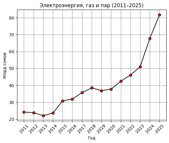 Еще один важный компонент — производство и распределение электроэнергии, газа и пара. В 2025 году этот сегмент обеспечил 81.8 млрд сомов против 24.2 млрд сомов в 2011 году. За 14 лет объем вырос более чем в 3.3 раза. После стабильного диапазона 22–38 млрд сомов в 2011–2020 годах отрасль начала ускоряться: 42.4 млрд сомов в 2021 году, 51 млрд в 2023, 67.8 млрд в 2024 и 81.8 млрд в 2025 году. Энергетика обеспечивает стабильность всей производственной цепочки и напрямую влияет на себестоимость продукции в других отраслях.