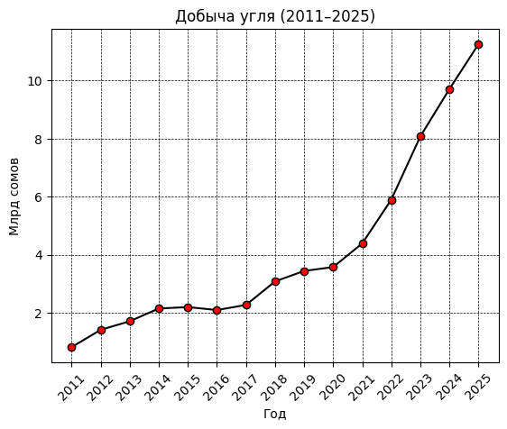 Внутри добычи полезных ископаемых заметную роль играет уголь. Производство каменного и бурого угля достигло 11.2 млрд сомов против 0.8 млрд сомов в 2011 году. За десятилетие сектор превратился из второстепенного в значимый источник промышленного выпуска.