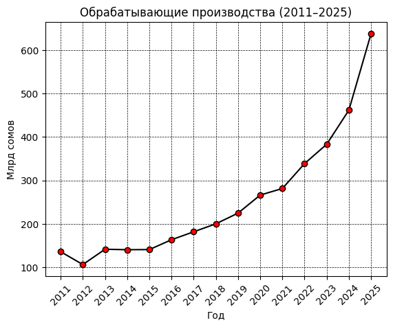 Основная масса промышленного объема республики формируется обрабатывающей отраслью — переработкой сырья и производством готовой продукции. В 2025 году обрабатывающие производства обеспечили 637.6 млрд сомов из общего объема 799.7 млрд сомов. Для сравнения: в 2011 году показатель составлял 135.6 млрд сомов. За 14 лет выпуск в переработке вырос почти в 4.7 раза. Именно здесь создается добавленная стоимость — пищевая промышленность, текстиль, строительные материалы, металлургия и другие направления. Доля переработки в структуре промышленности в 2025 году превышает 75 %, что подтверждает ее ключевую роль в индустриальной модели страны.