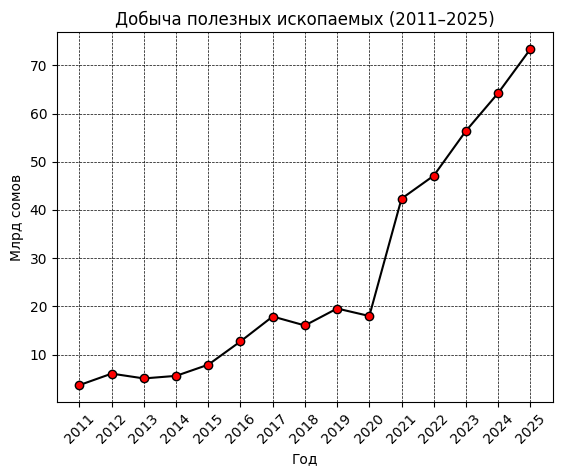 Одна из крупных индустрий КР — добыча полезных ископаемых. В 2025 году она обеспечила 73.4 млрд сомов. Для сравнения: в 2011 году объем составлял 3.7 млрд сомов. Рост почти в 20 раз. Это один из самых быстрорастущих сегментов промышленности.
