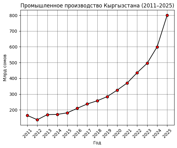 Объем промышленного производства в Кыргызстане по итогам 2025 года достиг 799.7 млрд сомов. Такие данные опубликовал Нацстатком. Это самый высокий показатель за весь период наблюдений и почти пятикратный рост по сравнению с 2011 годом, когда отрасль выпускала продукции на 164.4 млрд сомов.