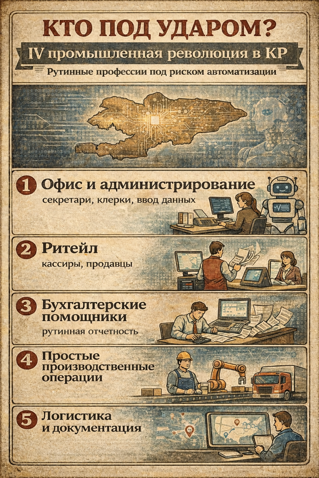 В контексте Кыргызстана под наибольшую угрозу автоматизации и потери рабочих мест в ближайшие годы попадают те профессии, где задачи повторяемы, стандартизированы и мало требуют творческого или человеческого взаимодействия.