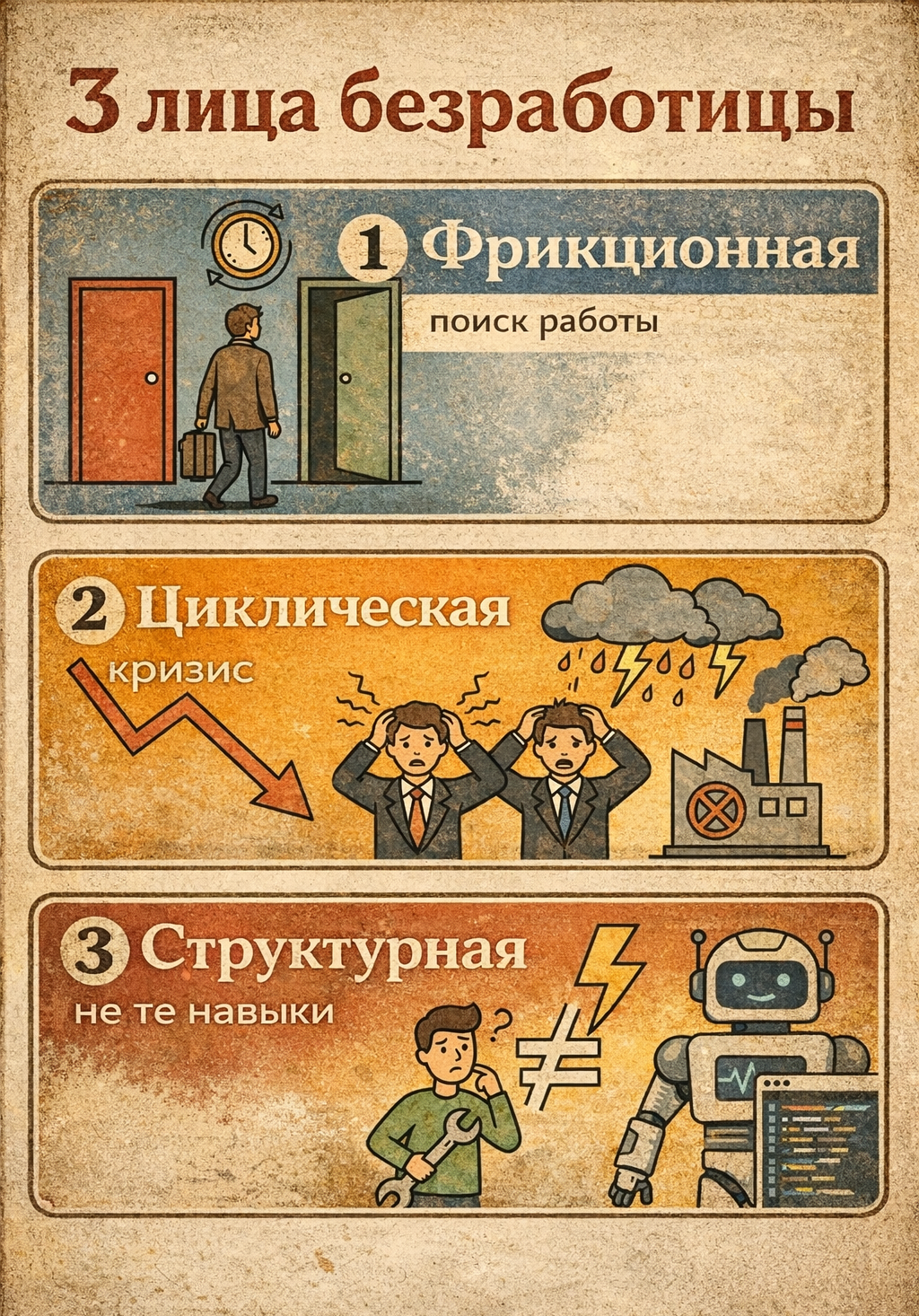 Безработица — это многоликое понятие, ведь состоит она из трех компонентов: фрикционного, структурного и циклического.