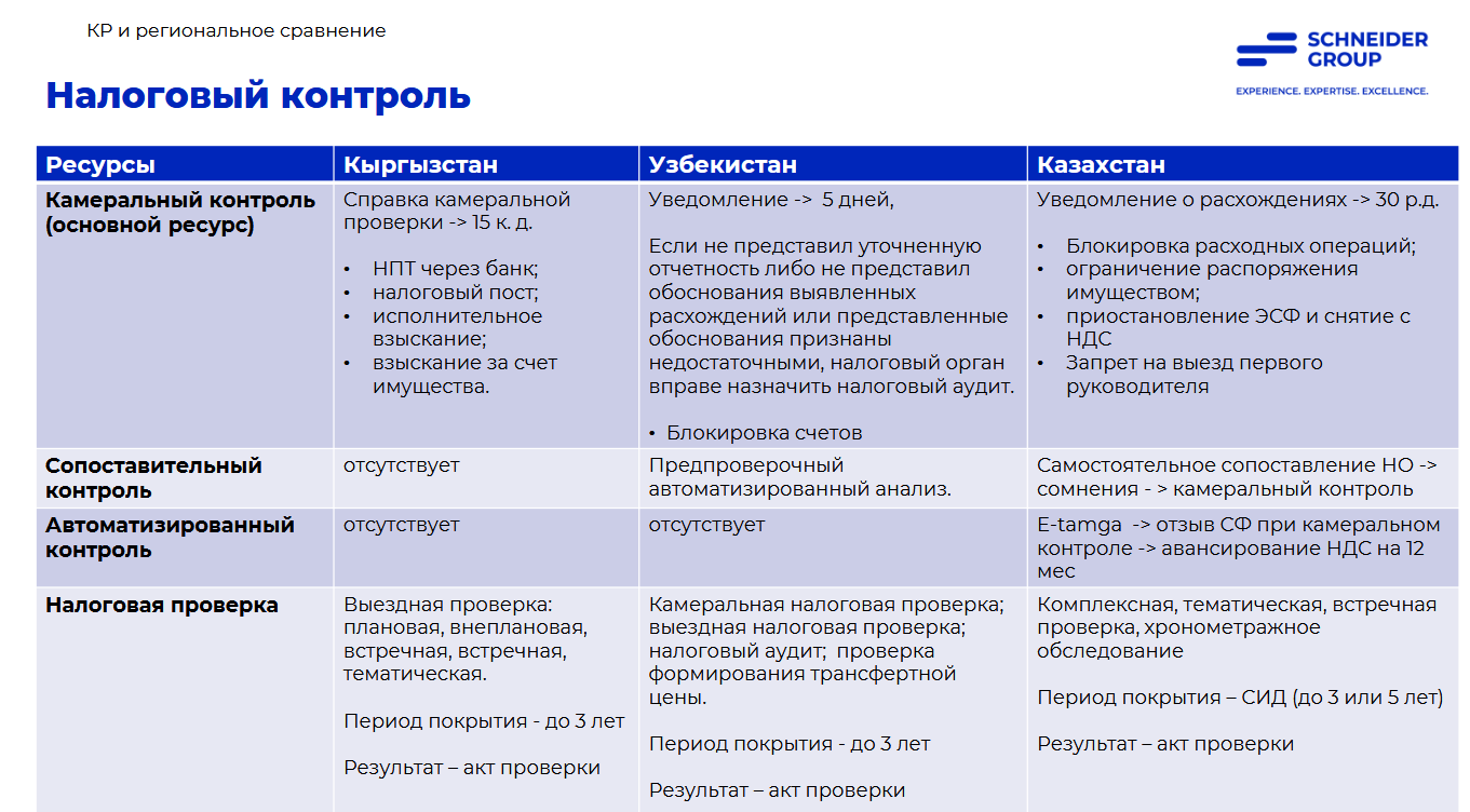 Казахстан также внедряет технологические новшества, такие как сопоставительный и автоматизированный контроль. Для налогоплательщиков с высокими рисками там предусмотрено автоматизированное подтверждение НДС.