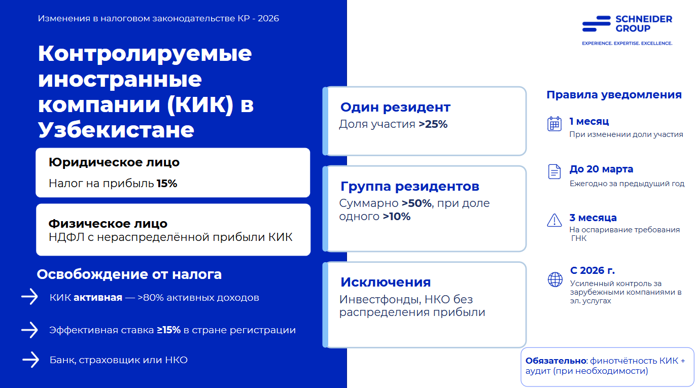 Также Кыргызстан лидирует по лояльности к компаниям, ведущим деятельность за пределами страны. Для них предусмотрен налог всего 0.1%. В Казахстане владельцы таких «контролируемых иностранных компаний» (КИК) платят 20% (юрлица) и 15% (физлица). В Узбекистане ставки составляют 15% и 12% соответственно.