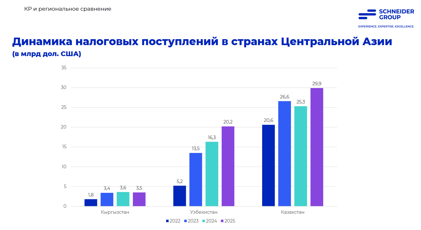 На этом фоне Кыргызстан демонстрирует устойчивость: несмотря на более низкие налоги, динамика поступлений в республике остается стабильной.