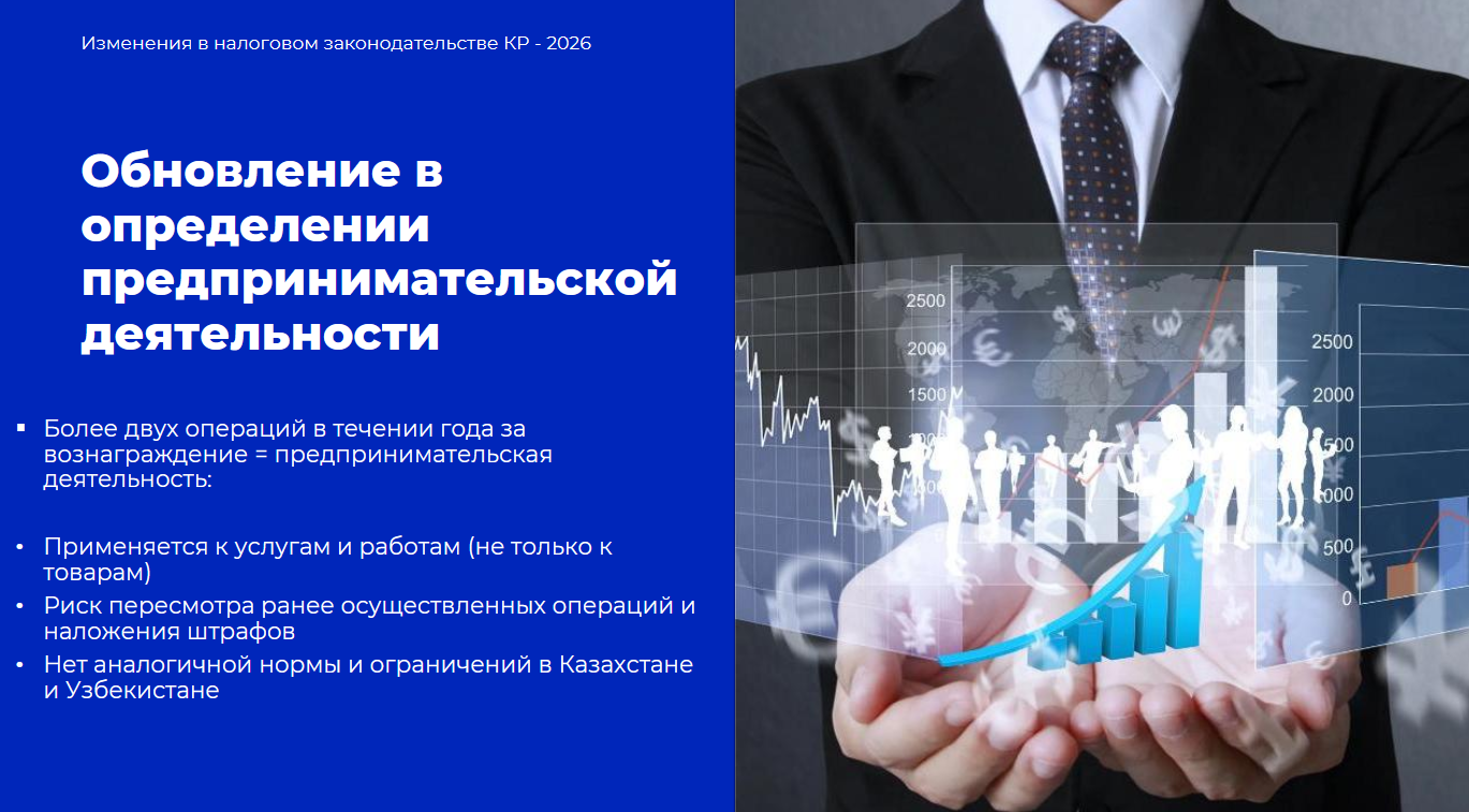 Важное изменение в законодательстве Кыргызстана коснулось определения предпринимательской деятельности. Теперь ею считается деятельность, носящая не разовый характер: