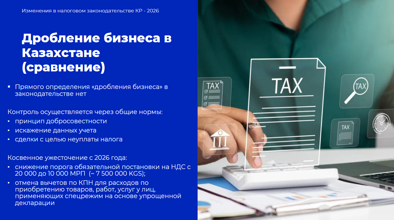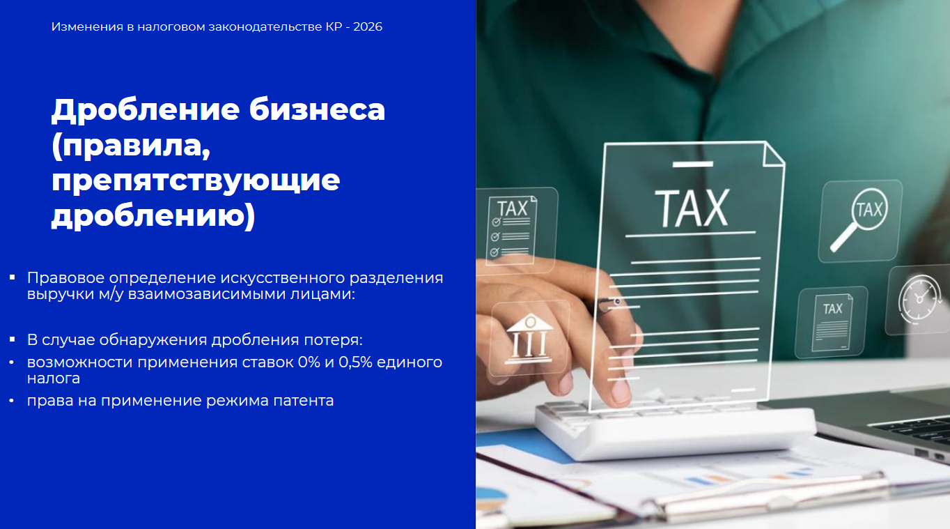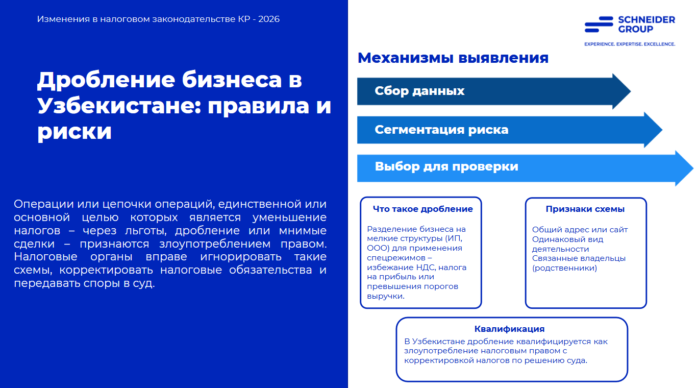 - в Кыргызстане: если выявляется дробление бизнеса между связанными сторонами ради льготных режимов, компанию просто лишают права на льготы и переводят на общеустановленный режим;