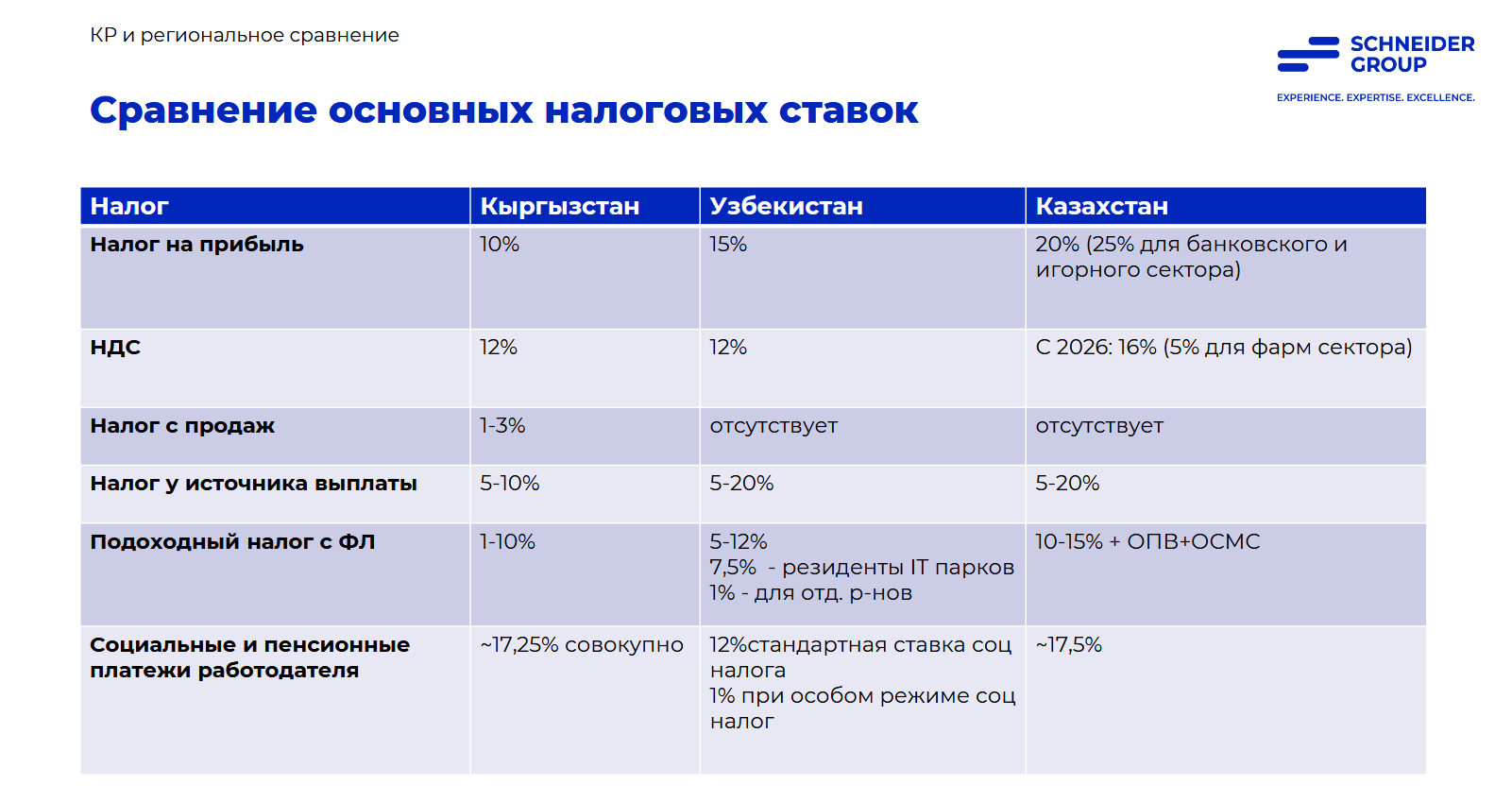 Главный вывод эксперта: Кыргызстан на сегодняшний день является страной с самыми низкими ставками налогообложения в Центральной Азии. Сравнение основных налогов показывает заметный разрыв: