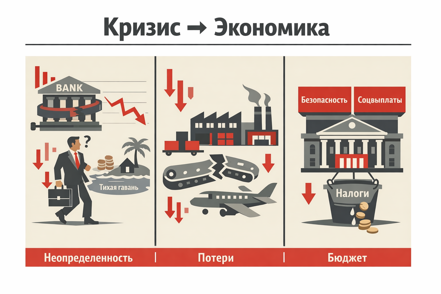 - Неопределенность: бизнес замораживает инвестиции, банки ужесточают кредитование, капитал уходит в «тихие гавани».