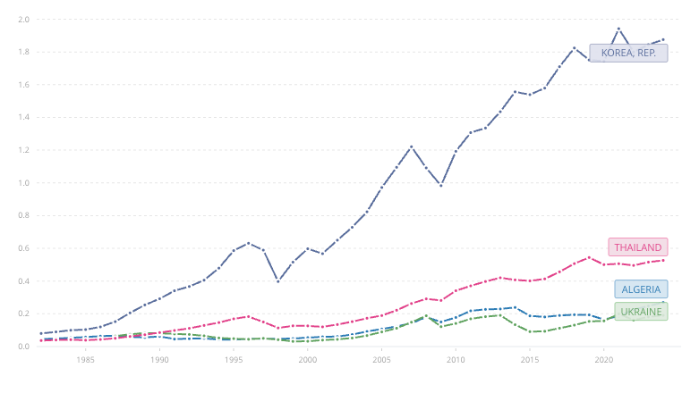 У одних стран, как у Южной Кореи, подобные шоки выходит быстро компенсировать и превратить в новые точки роста — кривая остается восходящей. У других, как у Таиланда или Украины, кризисы оставляют более глубокие «вмятины», замедляя долгосрочную динамику.