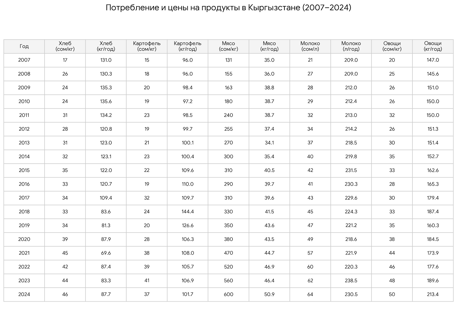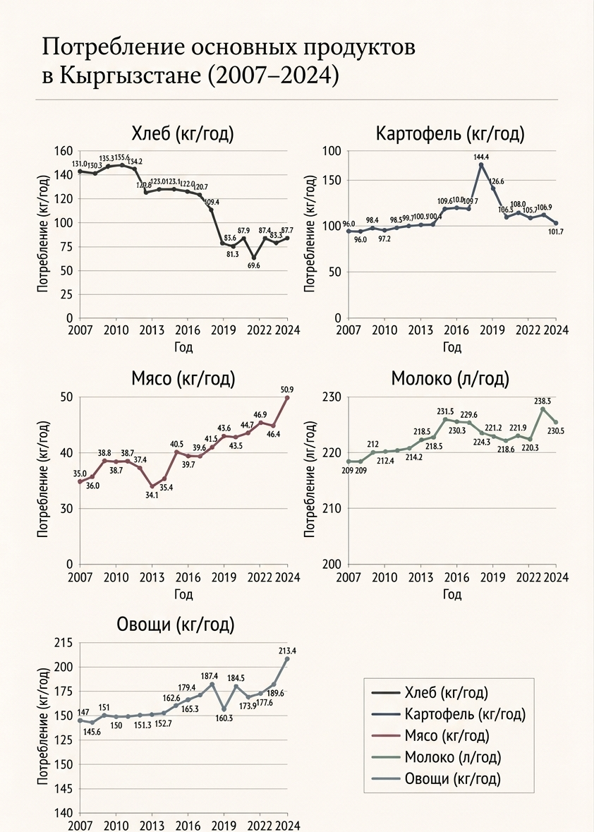 В собранных данных бросается в глаза перестройка всей структуры рациона. Долгосрочно Кыргызстан движется от максимизации калорийности к более разнообразному питанию: потребление мяса выросло с 35 кг в 2007 году до 50.9 кг в 2024 году (рост примерно на 45%), овощей — с 147 до 213.4 кг (также около +45%), тогда как молоко остается относительно стабильным — 209 против 230.5 кг (+10%).