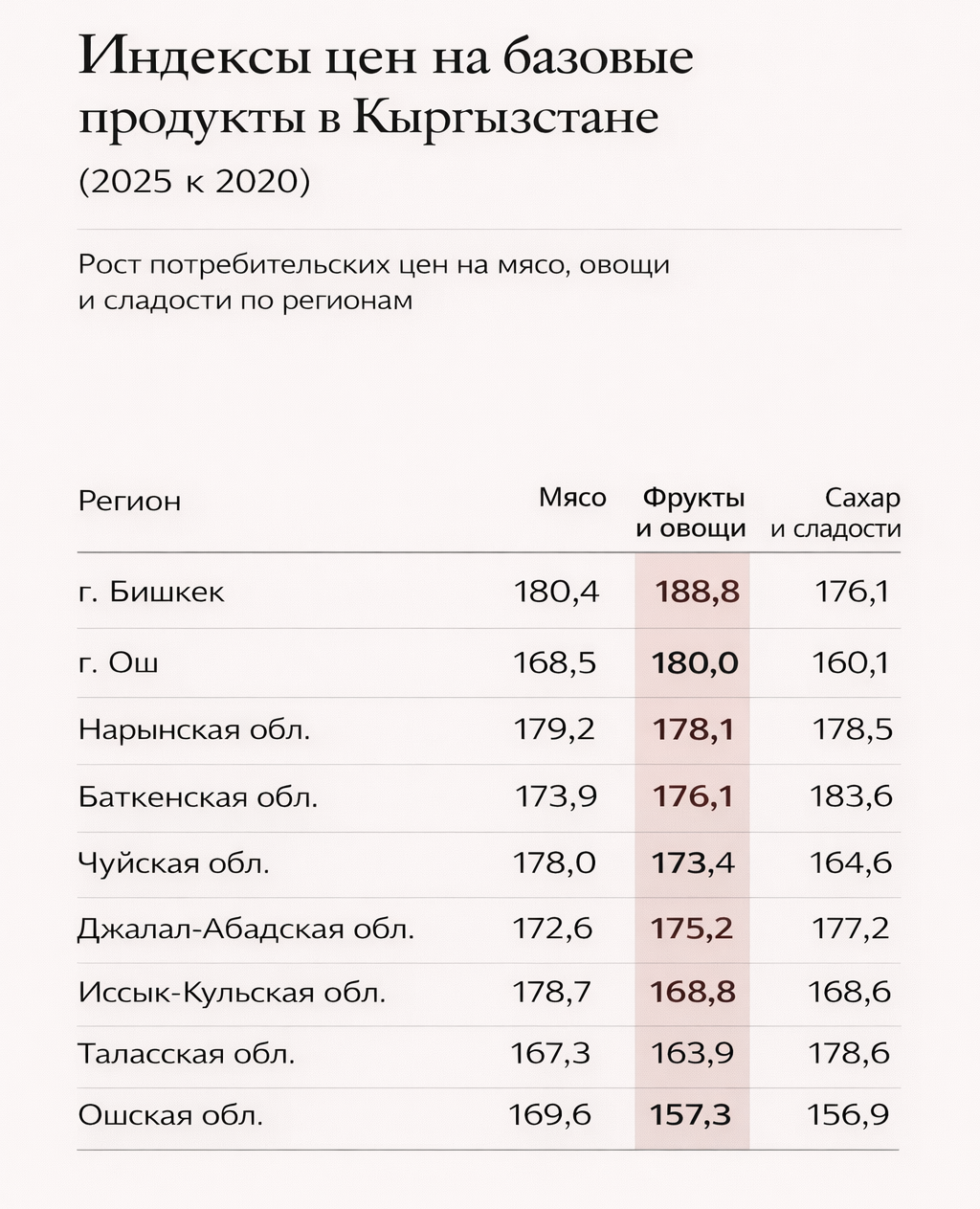 Динамика цен начала резко меняться еще в 2021 году, но пик подорожания пришелся на завершение пятилетки. Если в 2020 году продовольственная корзина считалась доступной для большинства граждан, то к началу 2026 года индекс цен на ключевые позиции в Бишкеке и Нарыне превысил отметку в 180 пунктов.