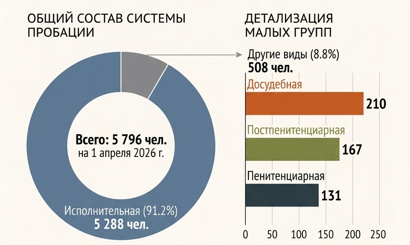 Для расчета масштаба экономического эффекта пробации нам пригодится официальная статистика профильного Департамента при Минюсте по состоянию на 1 апреля 2026 года — прежде всего общее число клиентов системы и их распределение по видам пробации.