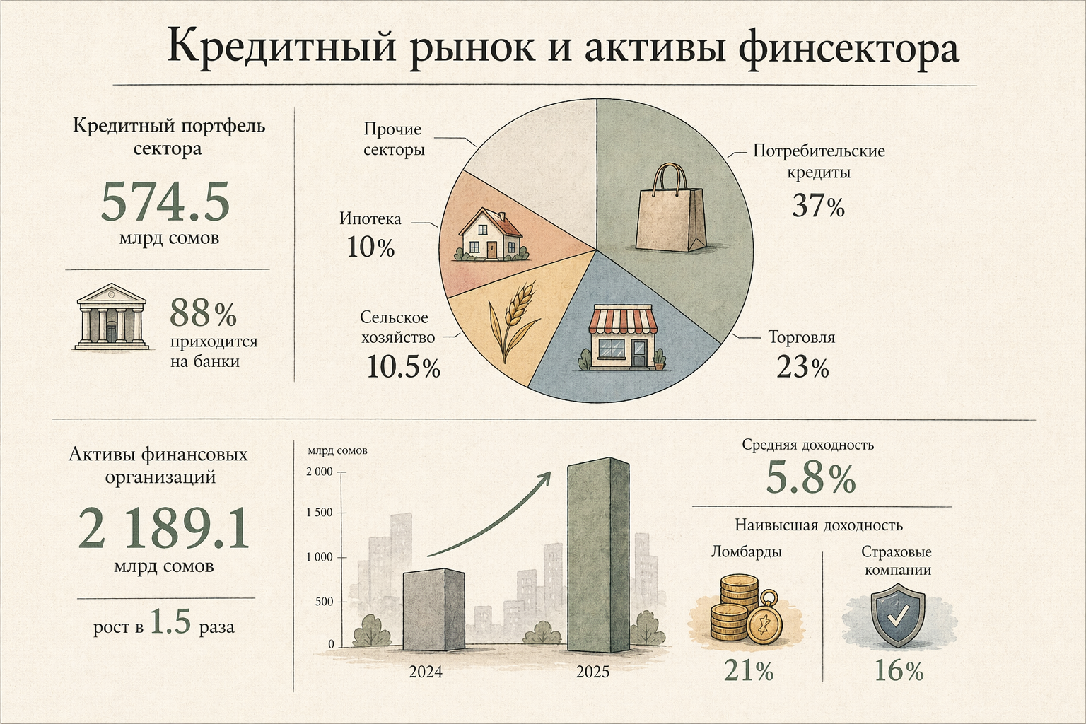 Основные направления — потребительские кредиты (около 37%), торговля (23%), сельское хозяйство (10.5%) и ипотека (10%). Активы финансовых организаций за год выросли в 1.5 раза и достигли 2 189.1 млрд сомов, при средней доходности 5.8%. Самая высокая доходность зафиксирована у ломбардов (21%) и страховых компаний (16%).