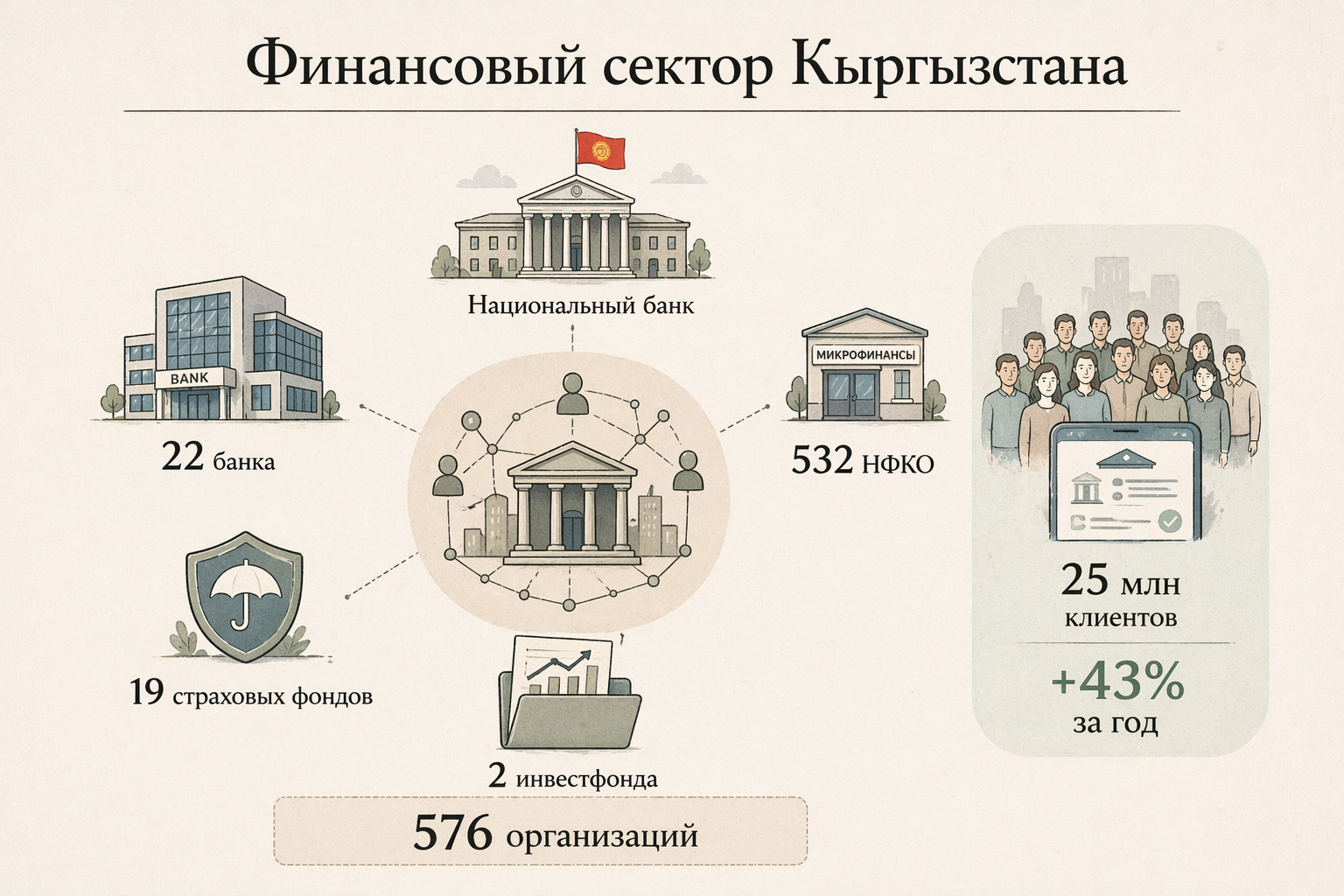 В секторе работали 576 организаций, включая Национальный банк, 22 коммерческих банка, 532 небанковские финансово-кредитные организации, 19 страховых компаний и два инвестиционных фонда. За год заметно расширилась клиентская база — до 25 млн, что на 43% больше, чем годом ранее.
