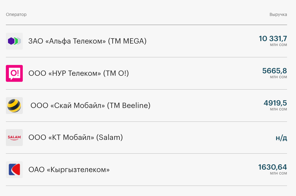 Крупнейшими игроками остаются «Альфа Телеком» (бренд MEGA) с выручкой около 10.3 млрд сомов, «НУР Телеком» (O!) — 5.7 млрд сомов, «Скай Мобайл» (Beeline) — 4.9 млрд сомов и «Кыргызтелеком» — 1.6 млрд сомов. Конкуренция между ними смещается из ценовой плоскости в качество покрытия, скорость и дополнительные сервисы.