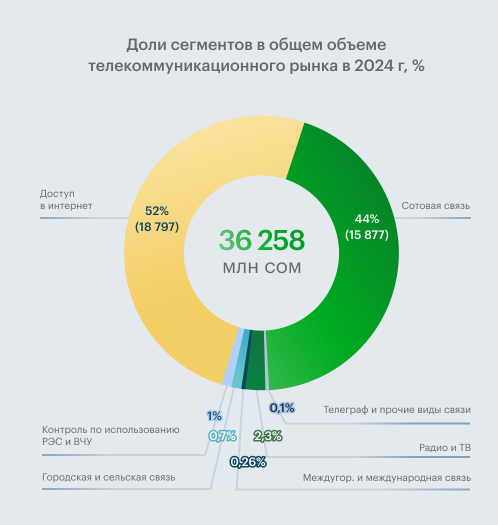 Основной рост теперь дает не количество пользователей, а объем потребляемых данных и сервисов. Структура рынка сместилась в сторону интернет-услуг. В 2024 году они заняли 52% выручки (18.8 млрд сомов), тогда как мобильная связь — 44% (15.9 млрд сомов). Остальные сегменты формируют менее 4% рынка.