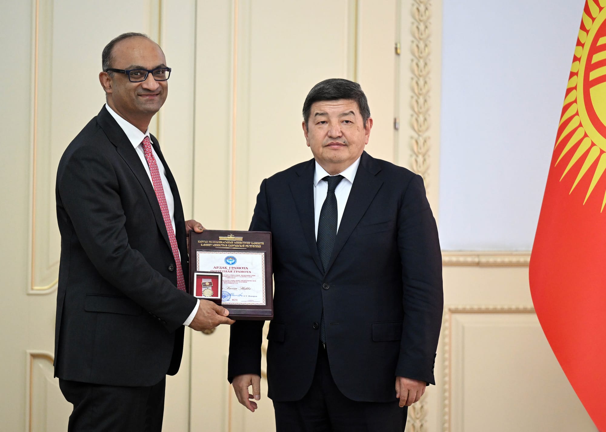 В завершении встречи Жапаров наградил Почетной грамотой кабинета министров главу представительства Всемирного банка в КР Навида Хассана Накви за значительный вклад в социально-экономическое развитие страны.
