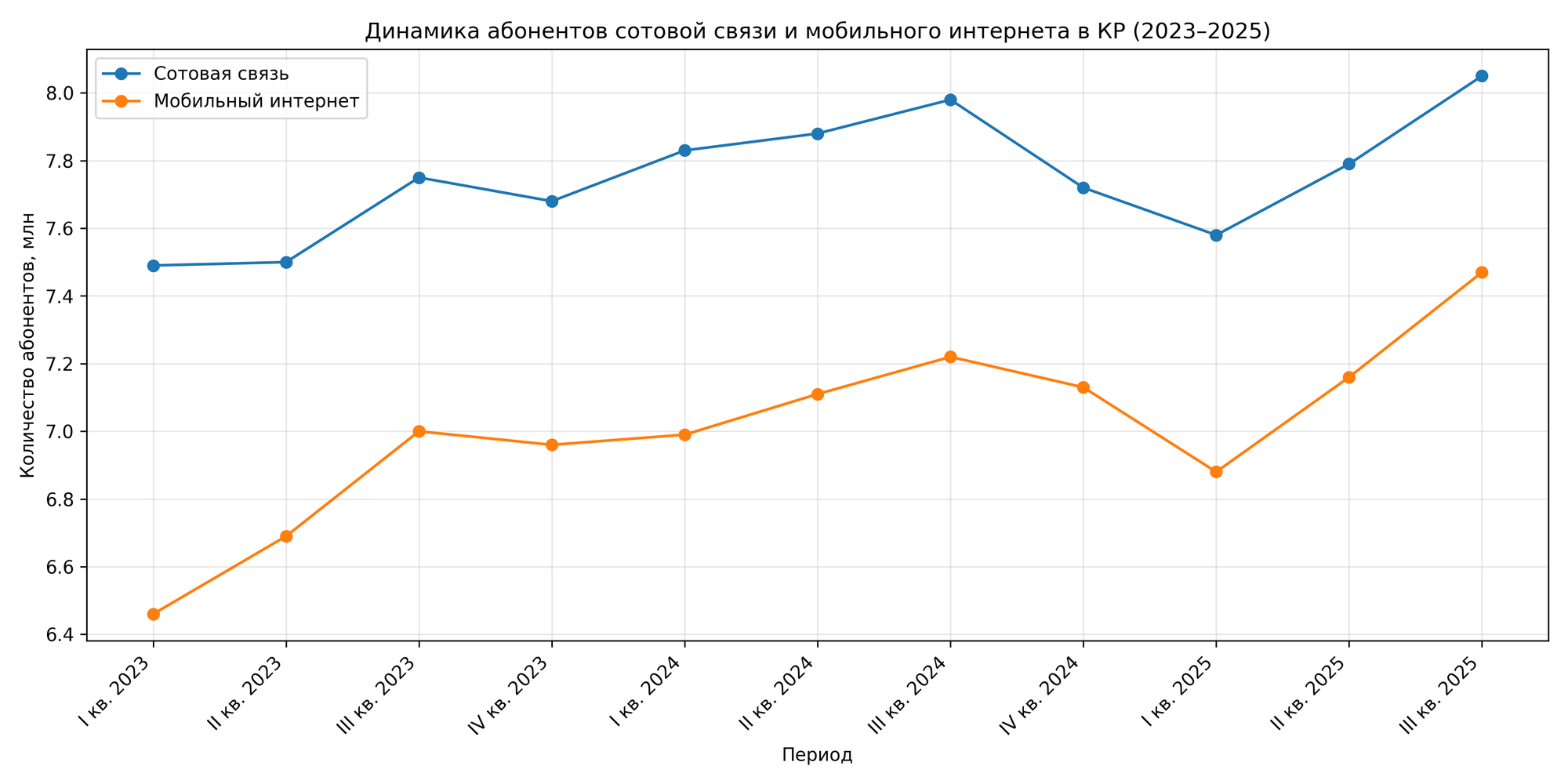 Рынок телекоммуникаций Кыргызстана в 2023–2025 годах сохраняет устойчивую динамику, при этом ключевым драйвером роста остается мобильная связь и передача данных, тогда как доля фиксированной телефонии продолжает сокращаться.