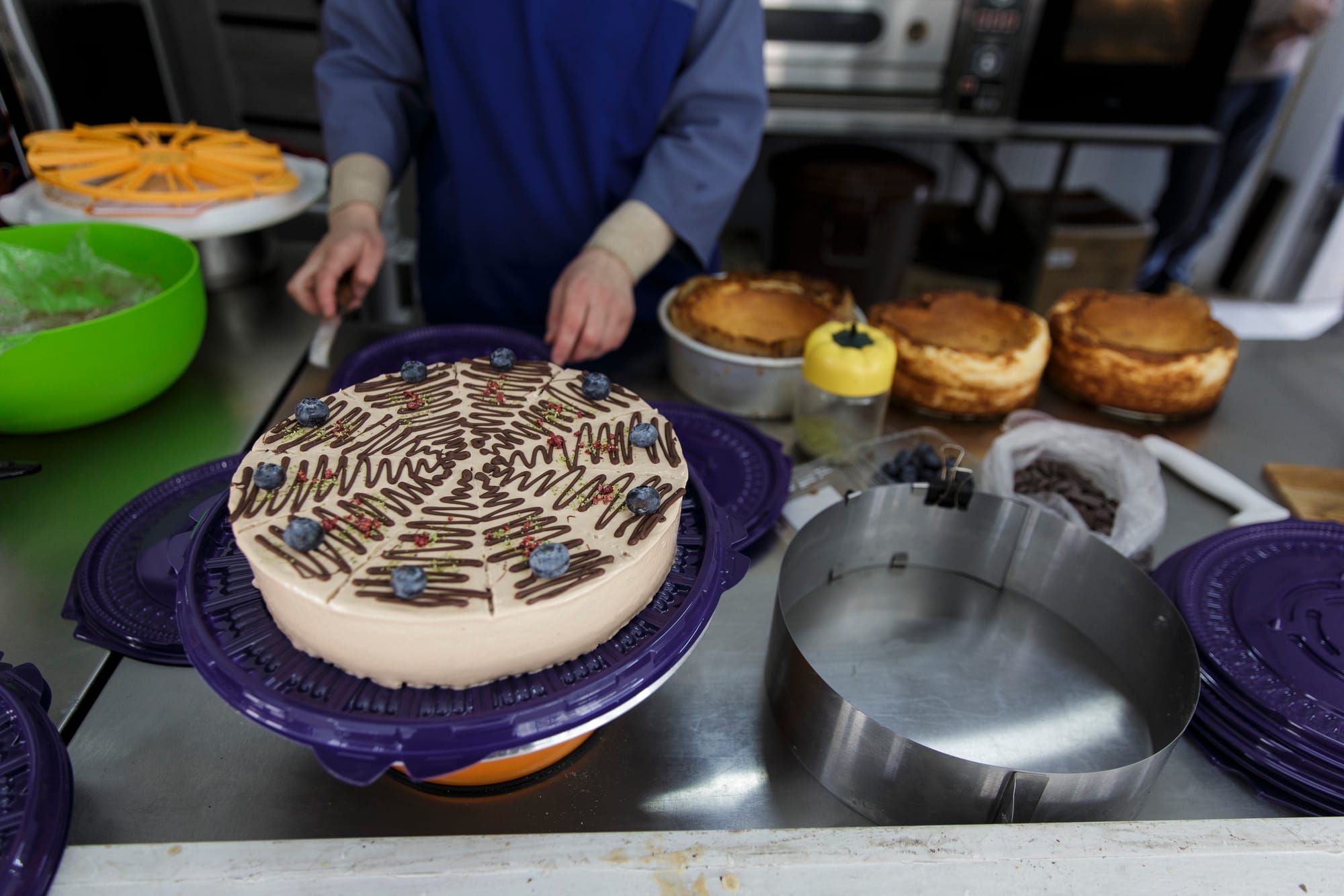 Производство тортов в кондитерском цехе «Жаркынай» начинается вечером с замешивания теста для коржей. Бисквитное тесто кондитеры разливают по формам, отправляют в печь и приступают к приготовлению нежной прослойки – творожной, ягодной или сливочной – в зависимости от вида торта. Тем временем воздушные, румяные коржи уже готовы. После остывания их щедро смазывают кремом, украшают и на несколько часов отправляют в холодильник для пропитки. Следующий этап – доставка готовой продукции в кофейни.