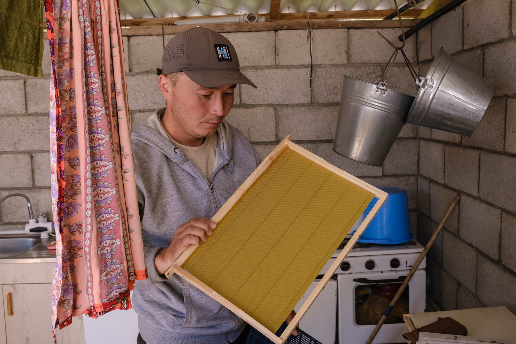 Азамат, начавший свой предпринимательский путь при поддержке пилотной программы «1+1» Международной организации по миграции (МОМ), производит сейчас экологически чистый мед и в будущем хочет создать собственный бренд.