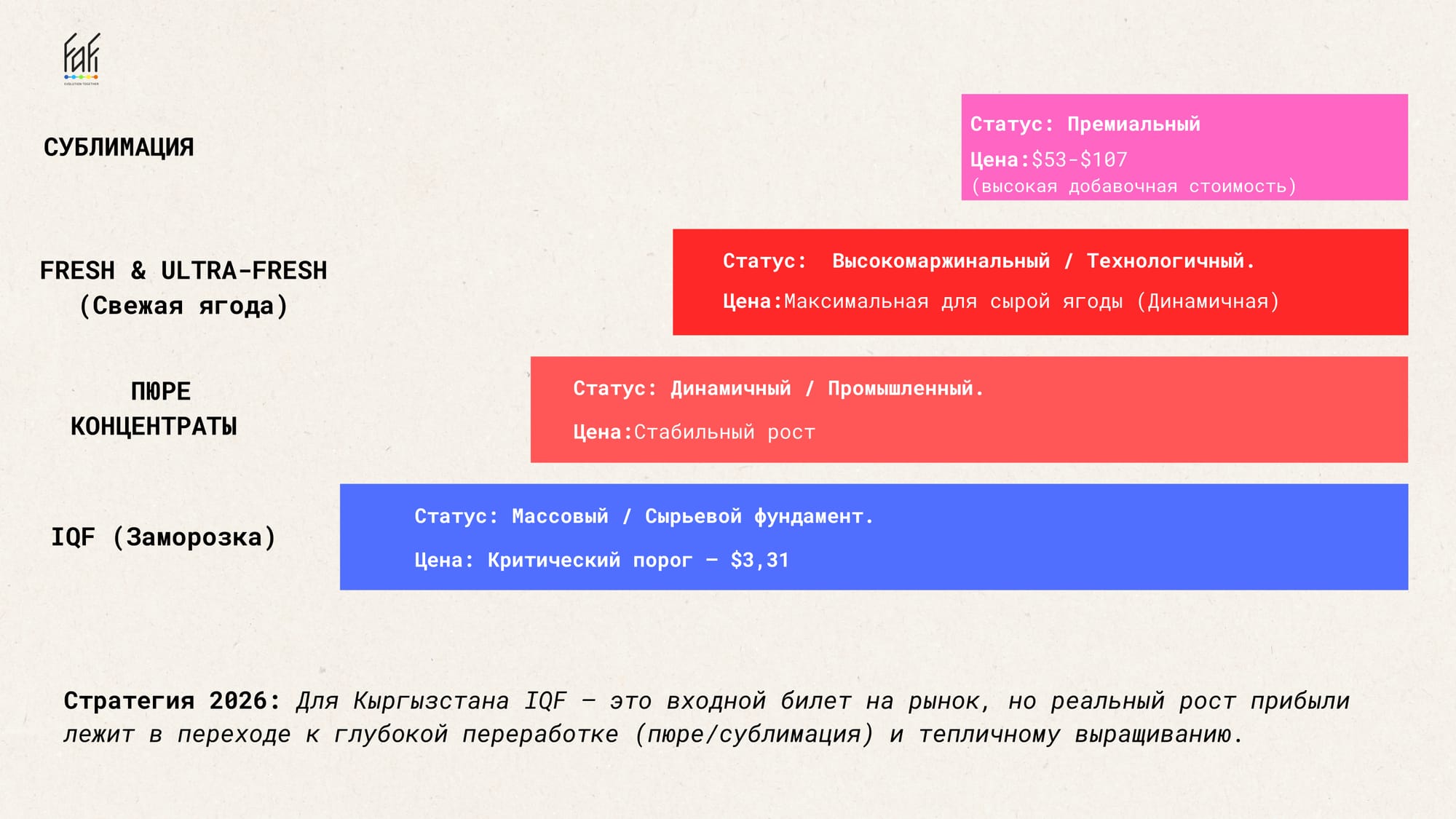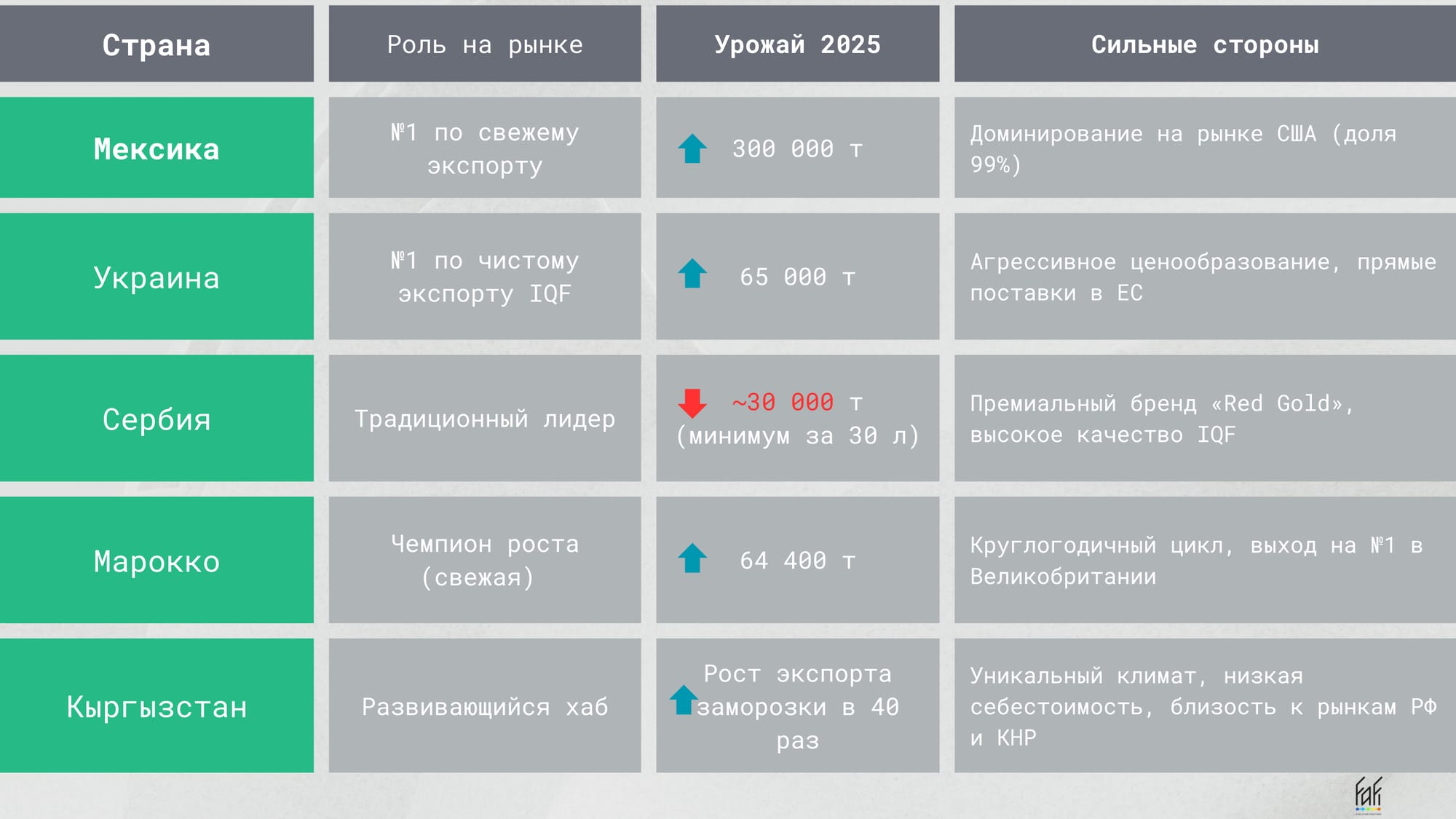 - Смена генетики: Для экспорта IQF в Европу или Китай необходимо переходить на твердые сорта (Heritage, Joan J) и сорта, пригодные для механизированной уборки (Wakefield), чтобы решить проблему дефицита рабочей силы.