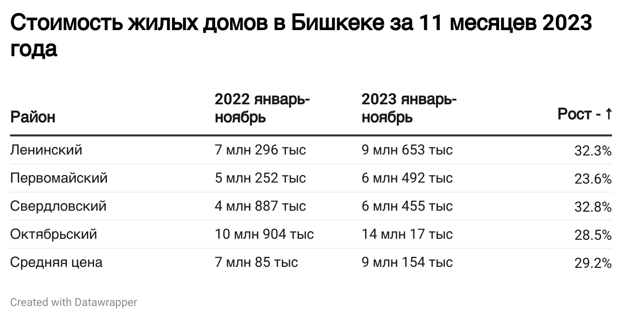 В период с января по ноябрь 2023 года цены на индивидуальные жилые дома в Бишкеке возросли по сравнению с аналогичным периодом 2022 года. Этот тренд наблюдался во всех районах города, как показано в таблице: