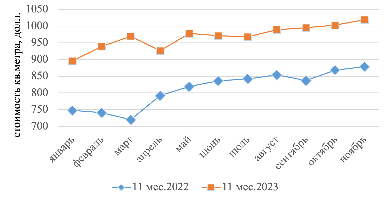 За январь ноябрь прошлого года средняя стоимость жилых домов в Оше составила 4 млн 823 тысячи сомов. В этом году цена выросла на 18.78% и составила порядка 5 млн 729 тысяч сомов.