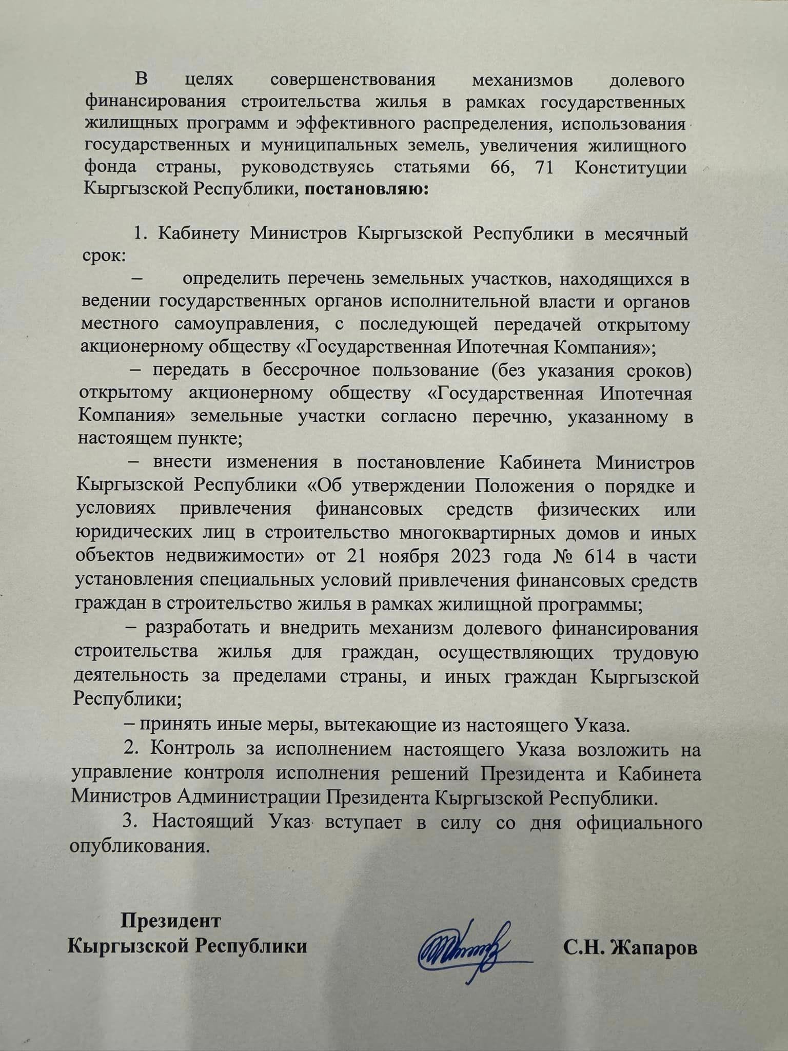 Правительство Кыргызстана определит перечень земельных участков, находящихся в государственной и муниципальной собственности – для их последующей передачи Государственной ипотечной компании. Об этом гласит подписанный президентм КР 30 января указ о мерах по совершенствованию механизмов жилищного обеспечения и строительства жилья для граждан КР.