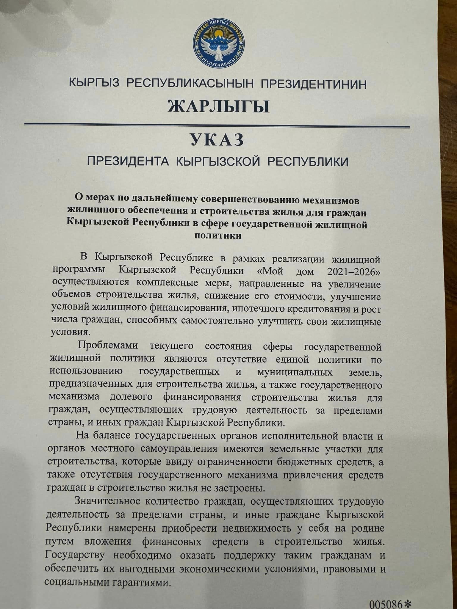 - Разработать и внедрить механизм долевого финансирования строительства жилья для граждан, работающих за пределами страны, и иных граждан КР.