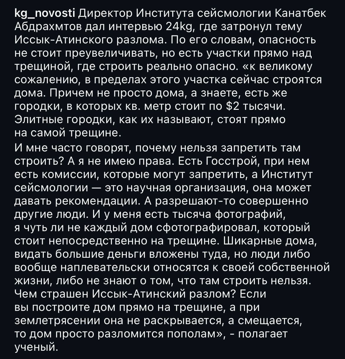 Государственный институт сейсмостойкого строительства и инженерного проектирования выступил с официальным заявлением в связи с появившейся в СМИ и соцсетях информацией о застройке Иссык-Атинского разлома. Об этом сообщили в Минстрое.