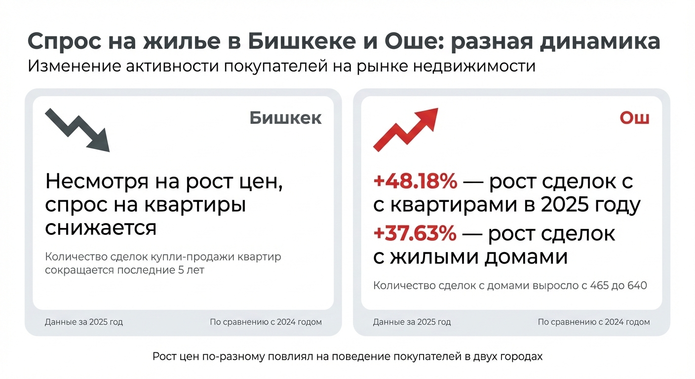 На фоне роста цен поведение покупателей в двух городах различалось. В Бишкеке, несмотря на подорожание жилья, спрос на квартиры начал ослабевать: за последние пять лет количество сделок купли-продажи квартир сократилось.