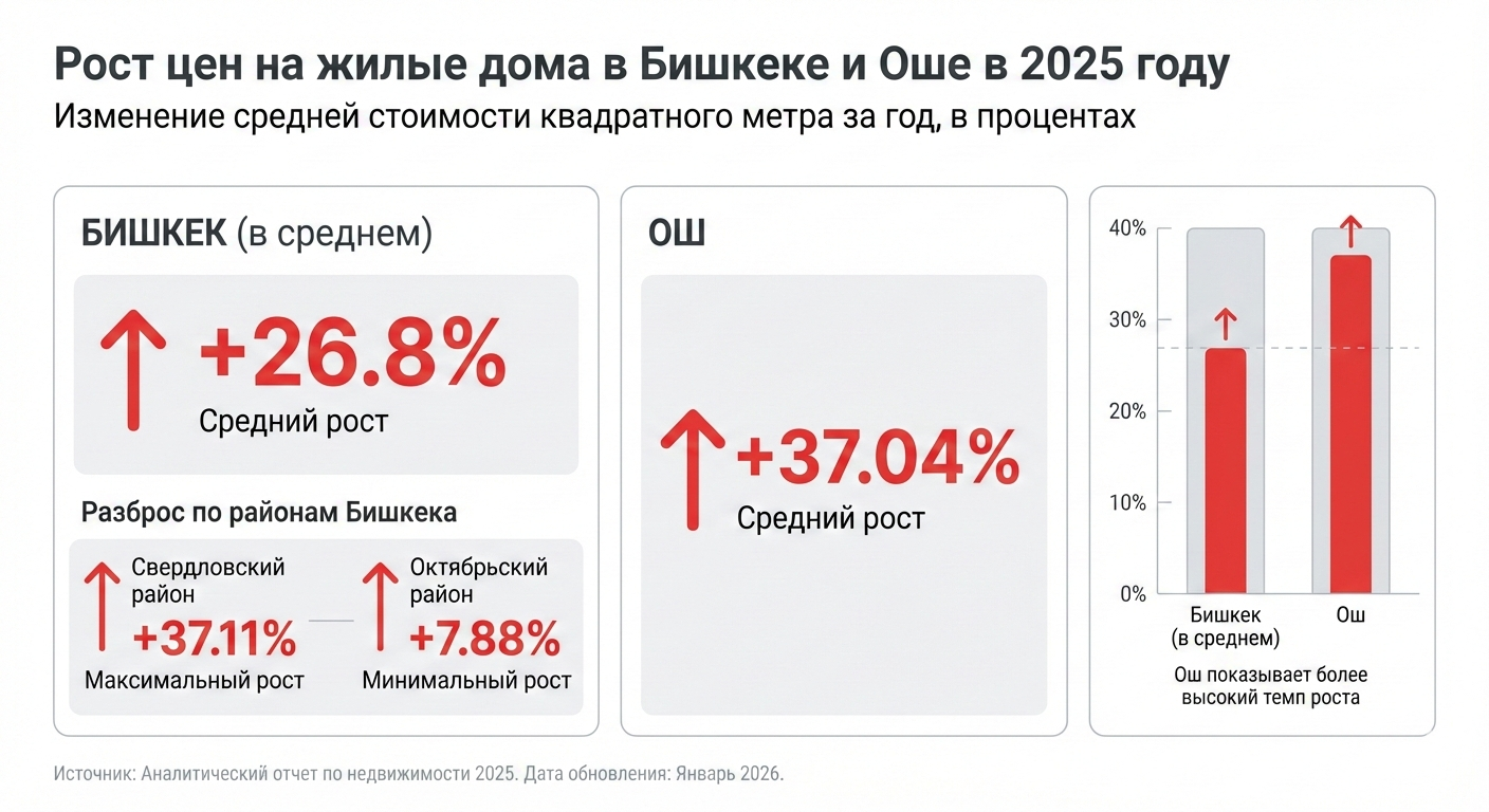 Жилые дома дорожали еще быстрее. В Бишкеке средняя цена квадратного метра за год выросла на 26.8%, при этом разброс по районам оказался существенным. Максимальный рост зафиксирован в Свердловском районе — 37.11%, минимальный — в Октябрьском районе, где цены выросли на 7.88%. В Оше рост цен на жилые дома составил 37.04%.
