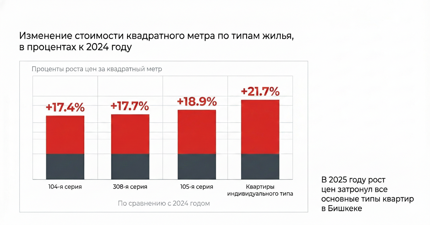 В 2025 году рынок жилой недвижимости в Бишкеке продемонстрировал устойчивый рост цен на квартиры всех основных типов. По сравнению с 2024 годом квадратный метр в квартирах 104-й серии подорожал на 17.4%, в 308-й серии — на 17.7%, в 105-й серии — на 18.9%, а в квартирах индивидуального типа — на 21.7%.