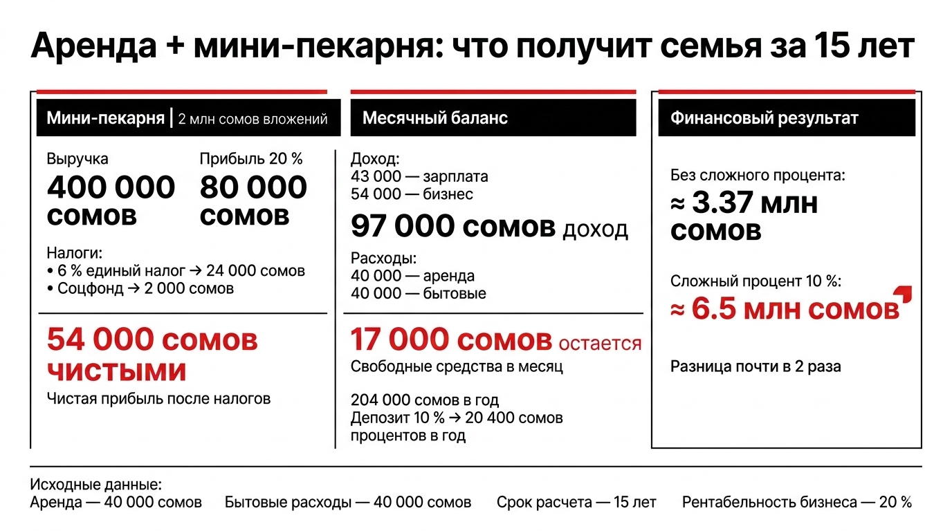 Рассмотрим альтернативный сценарий. Айгерим и Айбек решили отказаться от ипотеки и вложить 2 млн сомов в бизнес, открыв мини-пекарню. Они арендуют однокомнатную квартиру за 40 тысяч сомов в месяц, при этом Айгерим уходит с работы и полностью посвящает себя семейному делу. Оценим, как изменится финансовое положение семьи через 15 лет.