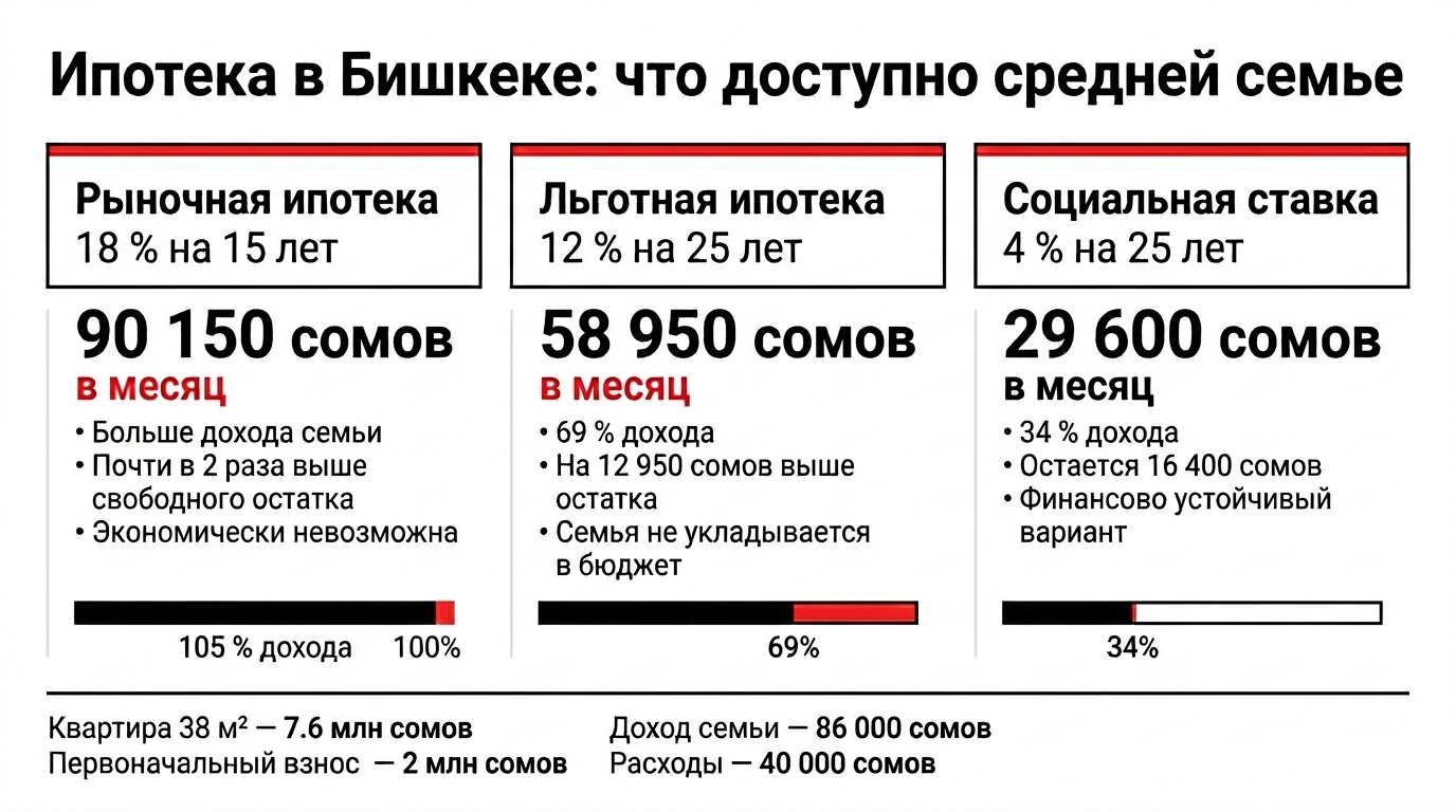И только социальная ставка в 4% на 25 лет меняет баланс: ежемесячный платеж около 29.6 тысячи сомов занимает 34% дохода, после него остается около 16.4 тысячи сомов запаса. Это соответствует банковскому ориентиру долговой нагрузки в пределах 30–40% и переводит покупку жилья из зоны математической невозможности в зону финансовой устойчивости.