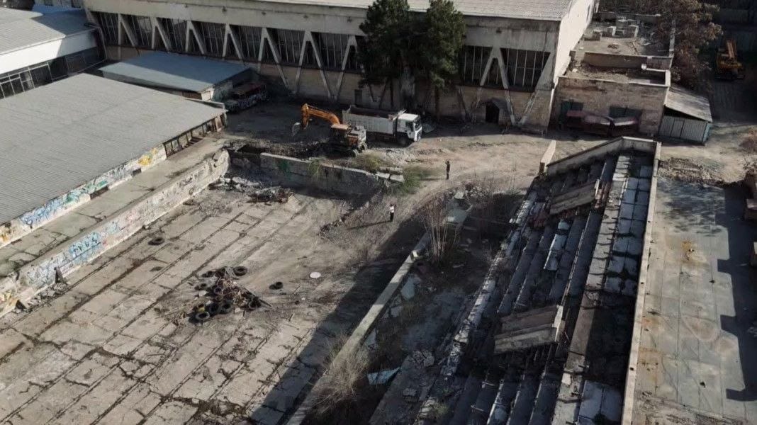 Во Дворце спорта имени Кожомкула в Бишкеке рабочие приступили к демонтажу старого бассейна. На площадке работает тяжелая техника — два экскаватора и 16 самосвалов убирают строительный мусор, освобождая место под будущую стройку.