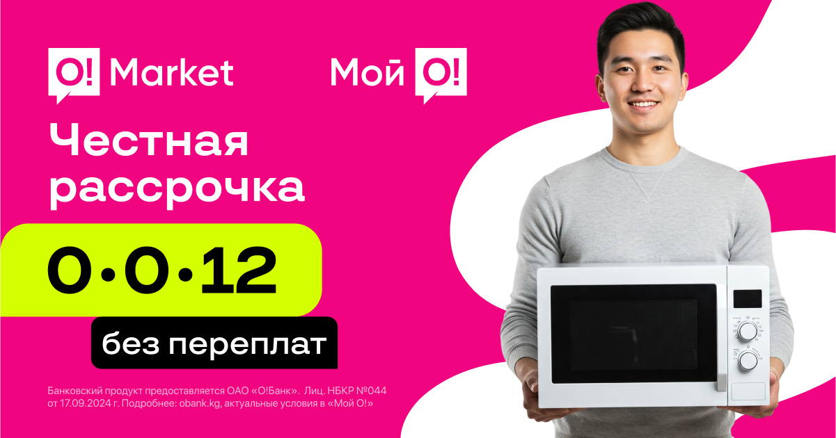 Рассрочка доступна на O!Market через суперапп «Мой О!» — выбирайте смартфоны, бытовую технику и другие товары с удобной оплатой.